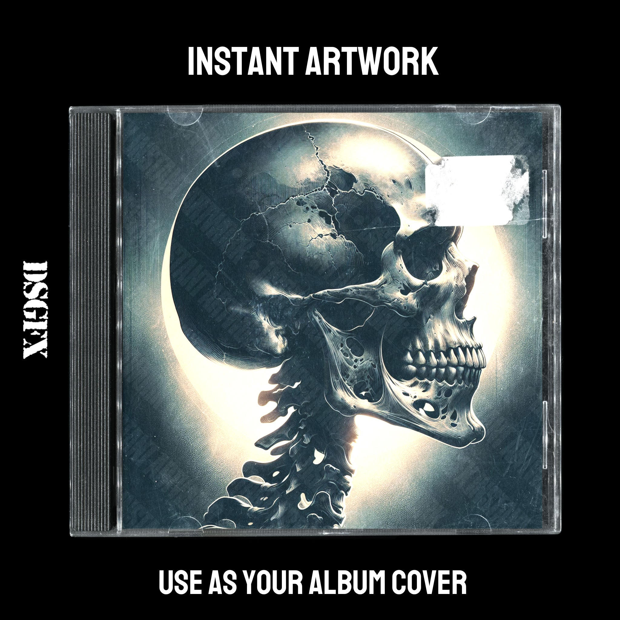 This high-contrast monochromatic piece showcases a skull with a cracked surface, half-enshrouded by shadows, set against a backdrop that suggests a cosmic eclipse. The stark visuals evoke a sense of mystery and the unknown, making it an ideal choice for artists seeking to convey themes of existential contemplation or to imbue their music with an aura of the otherworldly. Suitable for genres like alternative rock, dark pop, emo rap, or any introspective and edgy musical expressions.