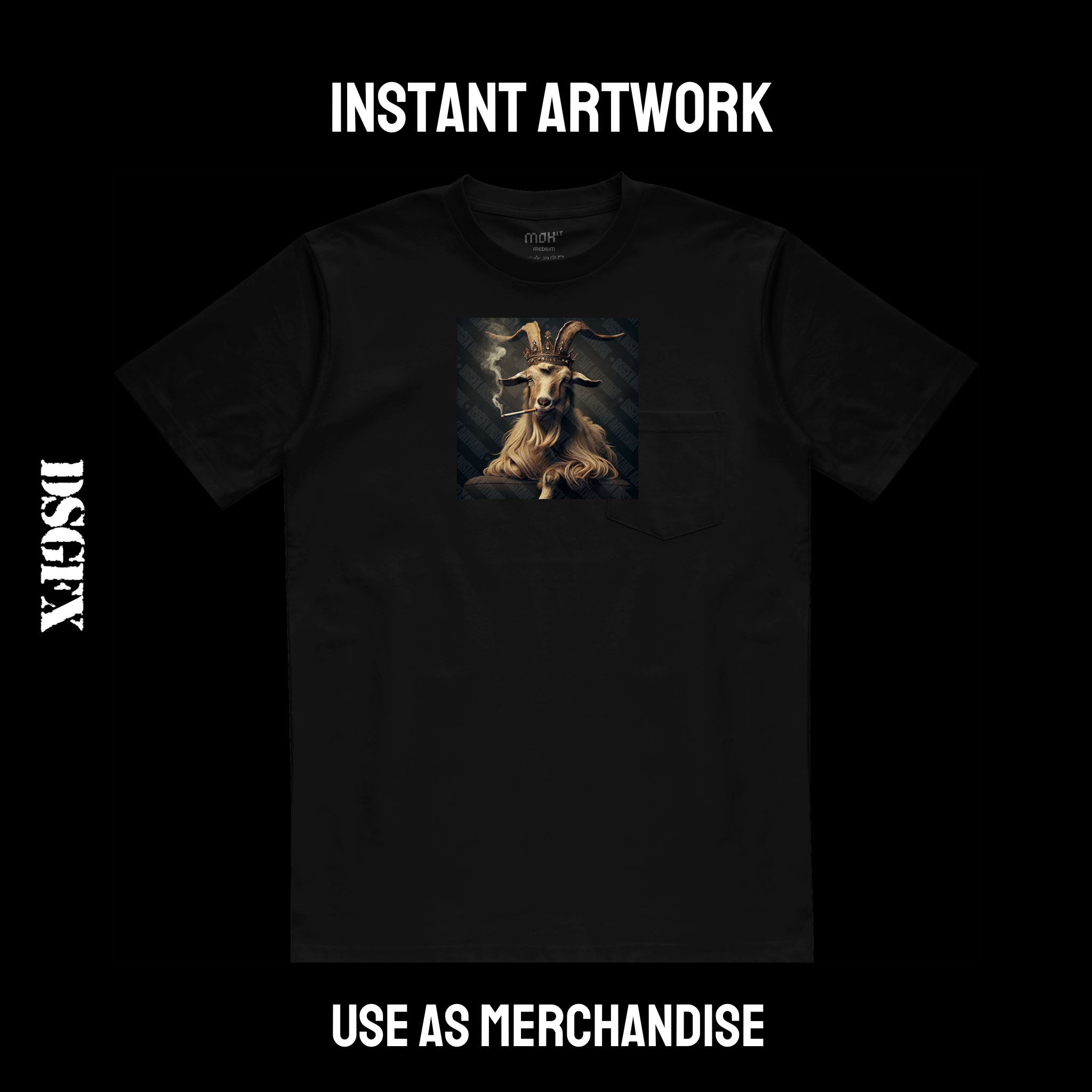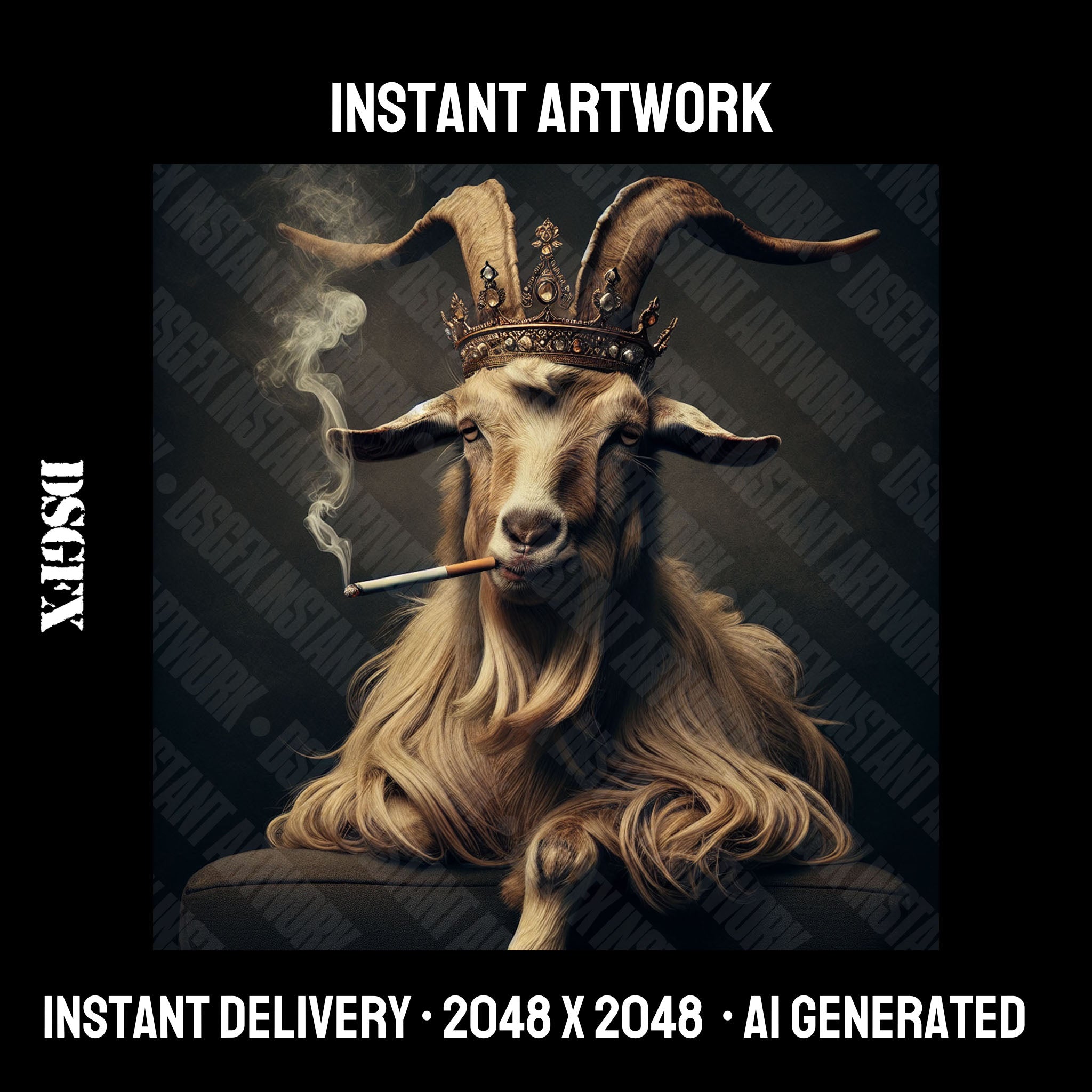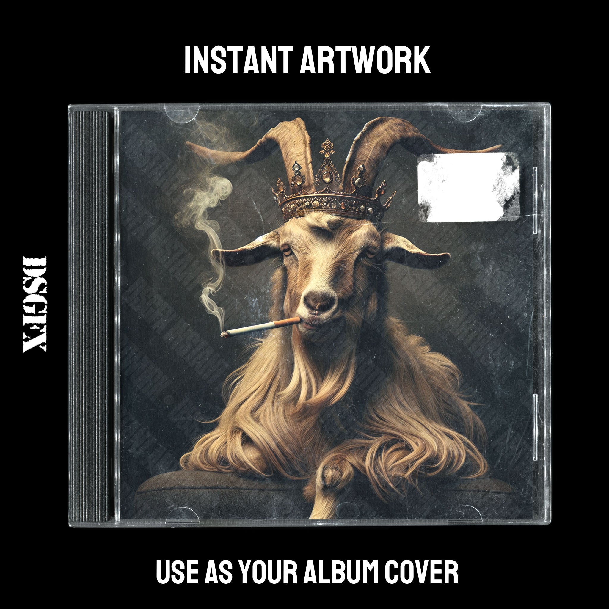 This evocative image features a regal goat with a commanding presence, adorned with an ornate crown, adding an air of nobility. The goat's piercing gaze exudes confidence, while the smoky trails from its cigarette suggest a touch of rebelliousness and mystique. The dark, textured backdrop accentuates the subject's majestic aura, making it a suitable choice for urban genres, gritty rock tunes, or soulful R&B melodies. The artwork conveys a fusion of grandeur and edginess that would resonate with artists looking to project a powerful and unconventional image.