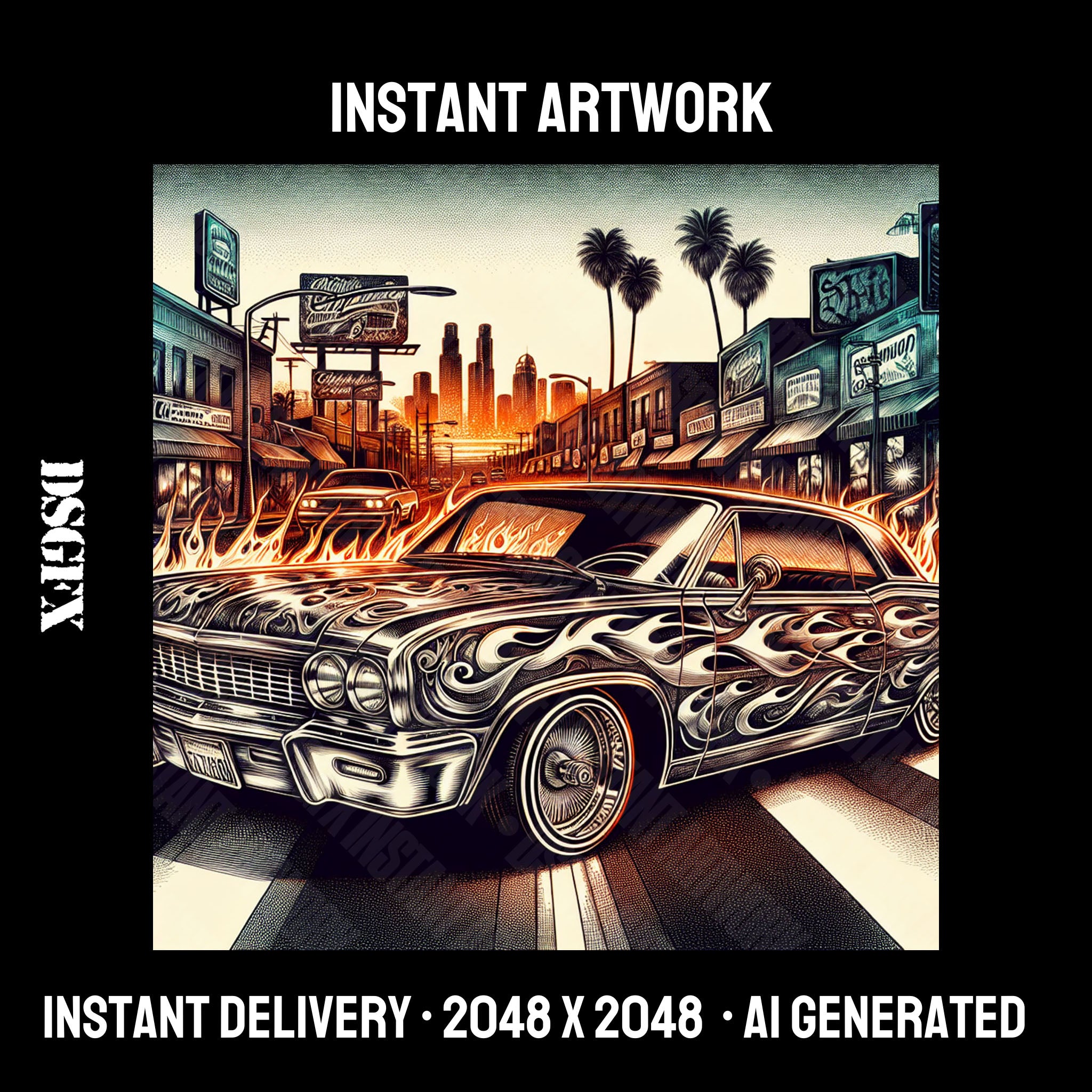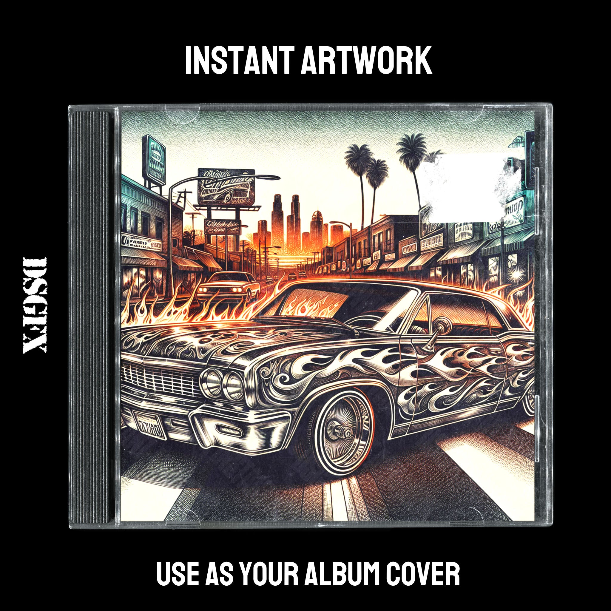 Illustration of a classic car with intricate flame detailing parked on a vibrant city street at sunset, capturing the essence of freedom and the urban lifestyle. This nostalgic and dynamic artwork fits well with genres like classic rock, urban music, and artists looking for a retro yet edgy feel in their cover art.